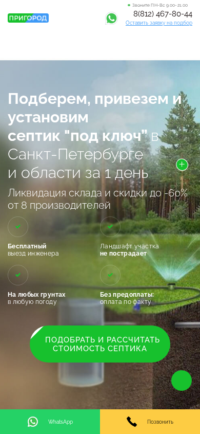 | AI-анализ | The portal "Septiks" offers services related to septic tanks, water supply, drainage, cellars, borehole drilling, and septic tank maintenance in Saint Petersburg and the surrounding area. The website provides a quick quote system for customers to determine the cost of a septic tank installation, and the company guarantees a response time of 13 seconds, as well as a free site evaluation and engineered solution. The portal also offers the liquidation of old septic tanks and discounts up to 60% from eight manufacturers. The company's response team is available from Monday to Sunday, 9:00 to 21:00, and customers can leave a request for a site assessment and installation within one day. The website is available in Russian and offers an online consultation with Artem Loshincev, a senior master. The quote system includes questions about the location of the septic |