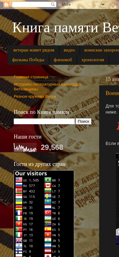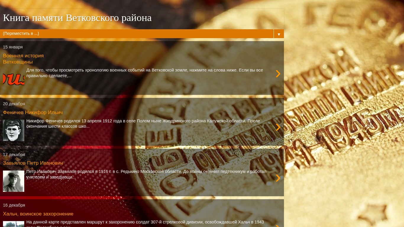 | AI-анализ | This website is dedicated to the memory of Vetkovsky district in Belarus. It features an historical-literary calendar of Vetkovshchina, a locality, and includes biographies of notable individuals such as Nikifor Fenichev, Petr Zavyalov, and Maxim Kravtsov, who were born in or lived in the district. The website also provides information on significant historical events, including military engagements, and lists of soldiers who died during the liberation of the district in 1943. The website is hosted on Blogger platform and was last updated by the authors Migalayte, Unknown, and Haltchanskaya basovaia shkola Technologii. |