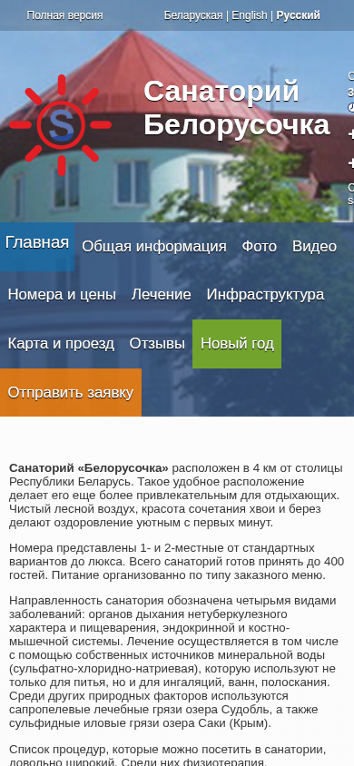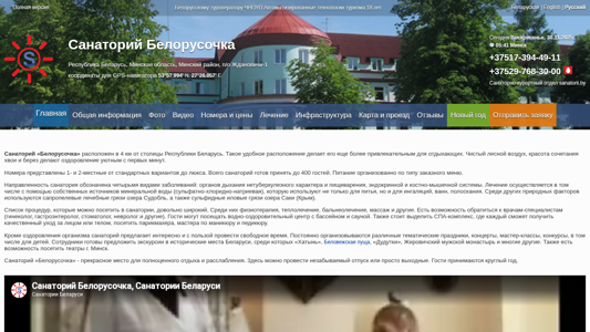 The website Belorusochka Sanatorii BY provides information about the Belorusochka Sanatorium located in Minskaya oblast, Republic of Belarus. The sanatorium is situated 4 km from the capital city and offers various types of accommodation from standard rooms to luxury suites, able to host up to 400 guests. The food is served à la carte. The sanatorium specializes in treating respiratory organs, digestive system, endocrine, and musculoskeletal system. It utilizes its own mineral water sources, used not only for drinking but also for inhalation, baths, and mouthwash. The treatment includes various natural factors such as sapropelic mud from Lake Sudobl and sulfide clay mud from Lake Sak (Crimea). The extensive list of procedures includes physiotherapy, thermal therapy, balneotherapy, massage