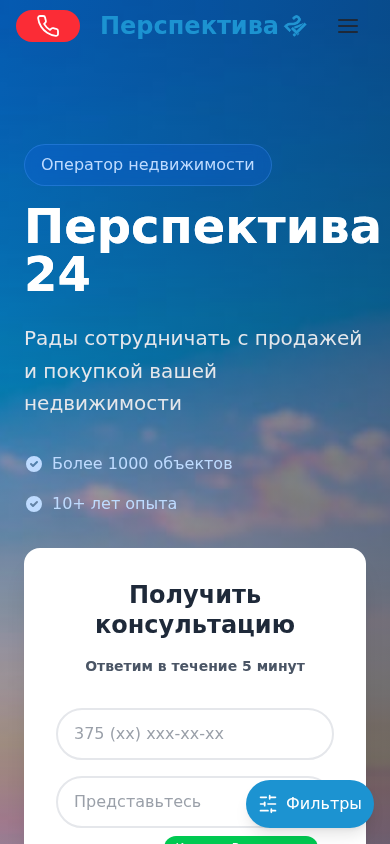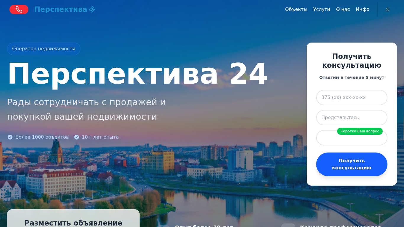 | AI-анализ | The website "Perspektiva 24" is a real estate agency based in Minsk, Belarus. It offers various types of real estate for sale and rent, including apartments, commercial properties, and houses. The website's title suggests that it specializes in one-bedroom apartments, but the description also mentions the availability of other types of properties. The agency claims to be reliable and is named "Perspektiva 24". Keywords associated with the website include "real estate Minsk", "buy apartment", "second-hand", and "rent apartment". The top words on the website are "region", "real estate", "second-hand", "apartment", and "Minsk". The website provides various services related to real estate operations, such as evaluating properties and offering consulting services. It also has a base of buyers and offers a calculator to estimate the value of |
