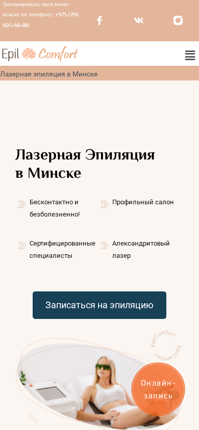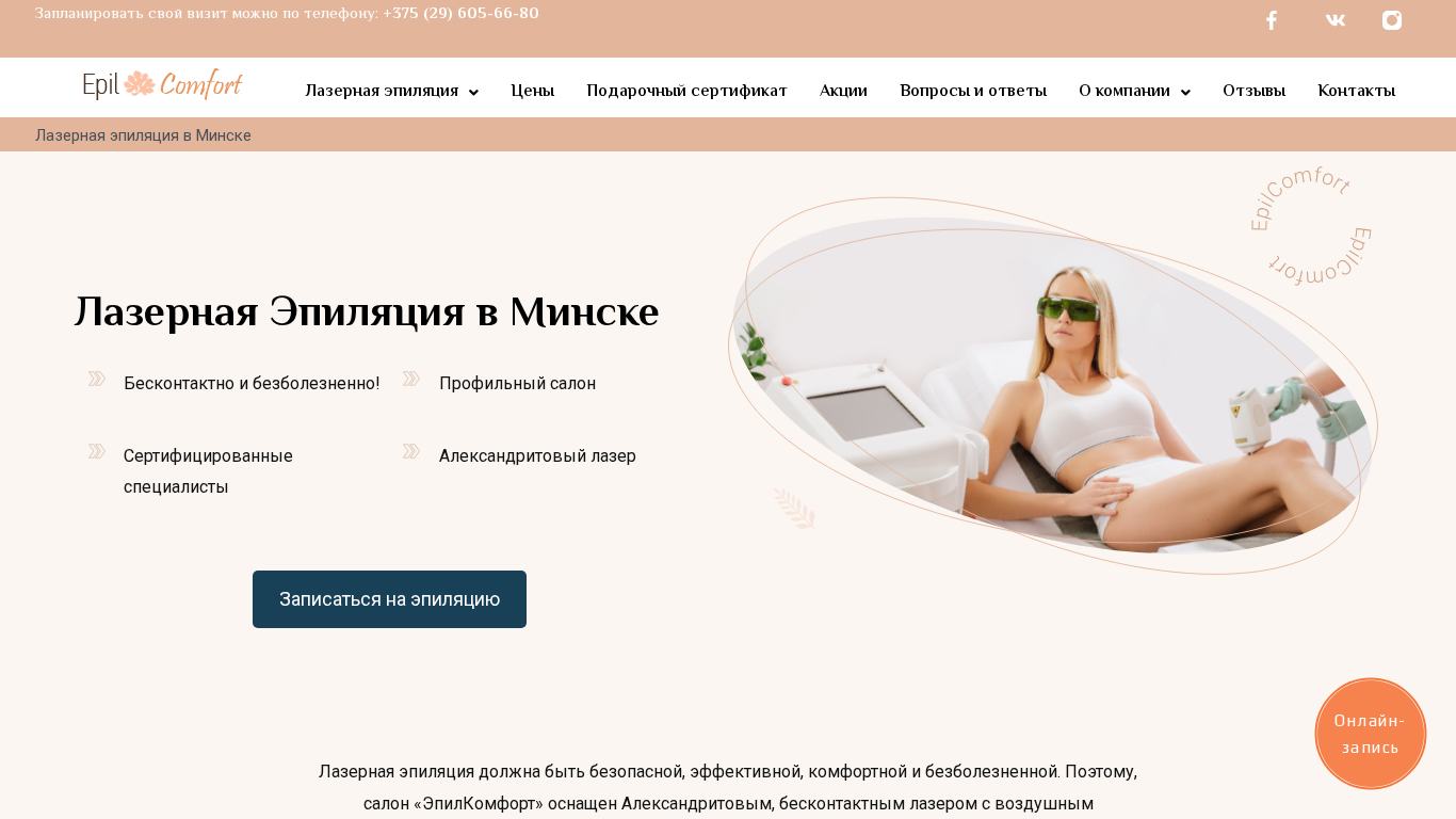 | SEO-описание | Центр лазерной эпиляции в Минске "ЭпилКомфорт" более 10 специализируется на лазерной эпиляции волос всего тела. Центр находится в центре Минска, в 5 минутах ходьбы от метро "Институт Культуры". ✔ Доступные цены. ✔ Гарантия результата. Записывайтесь онлайн и по телефону ☎ : +375 (29) 605-66-80. |