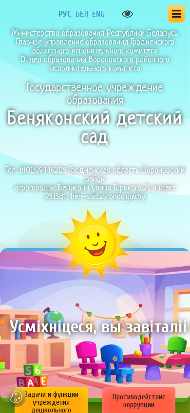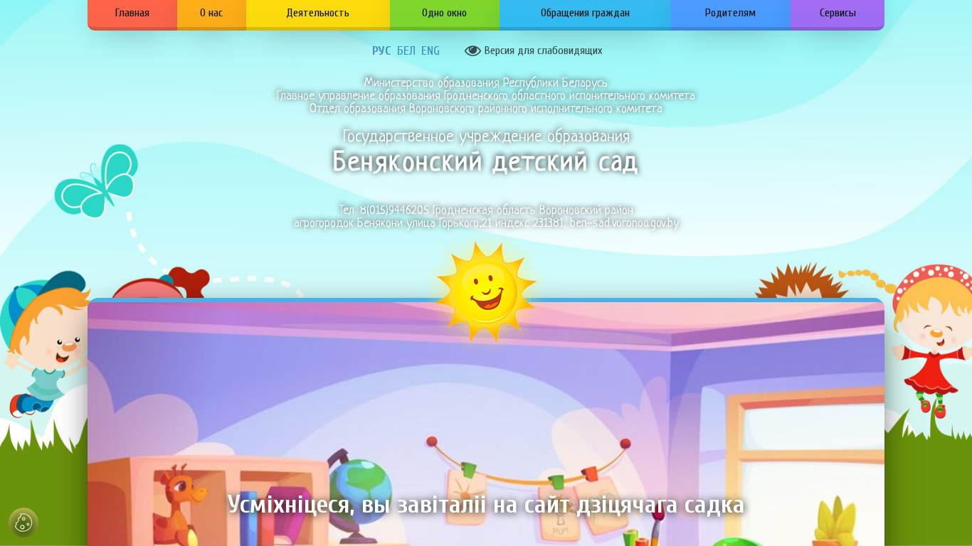 | Адрес | обязанности!, ‹, ›, ©, Беняконский детский сад, 2025, Гродненская область, Вороновский район, аг. Бенякони, ул. Горького, 21 |