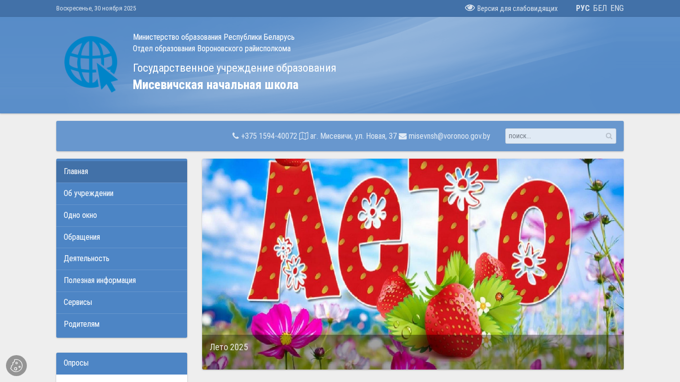 | Адрес | Актуально, Мы в соцсетях & RSS, ©, Мисевичская начальная школа, 2025, ВЕБ-МАСТЕРСКАЯ.БЕЛ, аг. Мисевичи, ул. Новая, 37 |