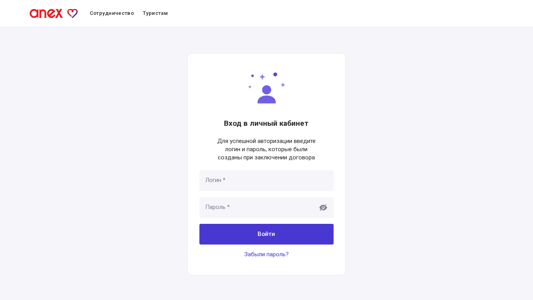 | AI-анализ | This website is a tour operator platform called ANEX Tour, providing search services for tours, air tickets, and cruises. The site includes an option for collaboration with tourists, a menu for navigation, and a login and password feature for access to a personal cabinet. Users are required to input their login and password, created during contract signing, for successful authorization. The site also offers a password visibility toggle, a "Forgot Password?" link, and a login field marked with an asterisk (*). The domain name is agent.anextour.by. |
