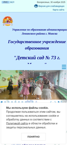 | AI-анализ | The web project "Ясли сад №73 г.Минска" (Preschool №73 in g.Minsk) is a government educational institution website located at ddu73.minsk.edu.by. The site primarily focuses on providing information related to the preschool, its structure, tasks, functions, and services. Users can find details about the administrative procedures, electronic application, schedules, and contacts. The site also includes sections for the policy on personal data processing and video surveillance, as well as a map of the location. Visitors can access information about the management, conditions for admission, important documents, and staff. Additionally, the site features sections for the pedagogical council, point of corrective-pedagogical assistance, and vacancies. The design includes options to adjust font size, line spacing, and color scheme. Cookies are used on the site, and |