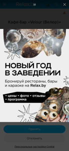 | AI-анализ | The website 'Velour (Velour.relax.by)' is dedicated to the Velour café-bar in Minsk, located at ul. Timiryazeva 65A. The site provides menu prices and photos, customer reviews, the address on a map, and online table booking through Relax.by. |