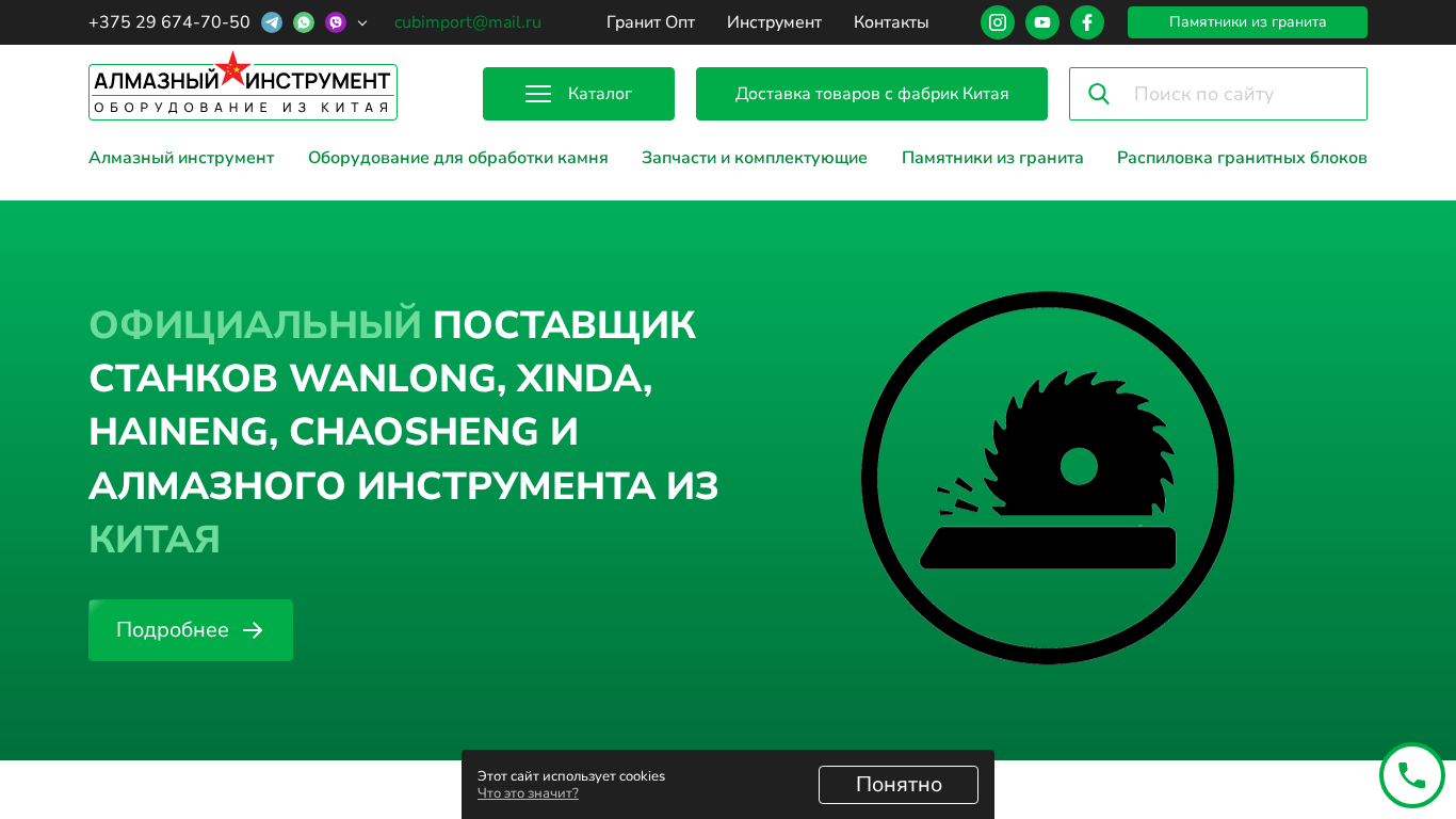 | AI-анализ | This website is an opt for granite tools and machinery supplier from Belarus, providing contacts, catalogs, and information on granite monuments and delivery of goods from China. Keywords include granite, opt, instruments, machinery, and contacts. Top_words are numbers, granite, instrument, blocks, almaznyy, processing, parts, availability, and monuments. The company offers a range of machinery for cutting, shaping, and polishing granite, including band saws, circular saws, and CNC machines. Also provided are replacement parts and accessories. The website includes a contact section with phone numbers and email address. The company has been importing stone working machinery from China since 2008. Services include the cutting and shaping of granite blocks into custom sizes for monument creation. Natural stone is available in various sizes and colors, with some being rare. The company also offers polishing |