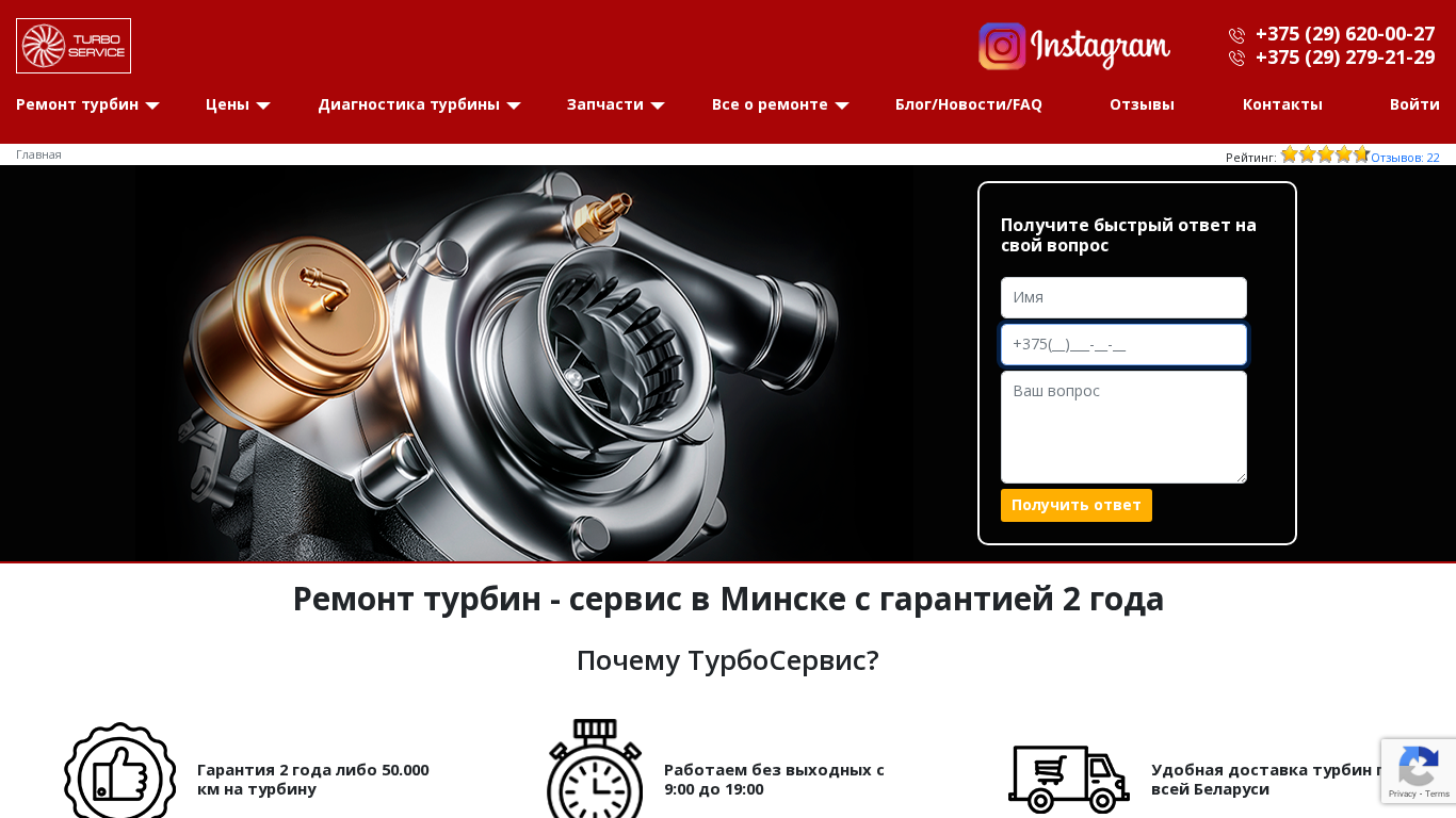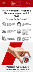 | SEO-описание | Ремонт турбин Минск - гарантия 2 года. Диагностика, ремонт со снятием и установкой за 1 день от 150 BYN. ТурбоСервис — ваш сервис по ремонту турбины в Минске. |