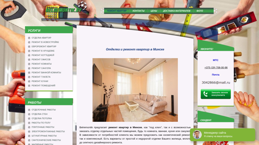| AI-анализ | This website is an apartment renovation and repair service based in Minsk, Belarus. The company offers both full-service renovations under contract, as well as the option to order specific room renovations. Services include cosmetic repairs, comprehensive renovations, renovations of single-room apartments, two-room apartments, and three-room apartments. The company provides contacts and a website address for inquiries. The website offers information on prices, delivery of materials, and various types of renovation work such as tiling, plastering, electrical work, and painting. The site also mentions renovations in new buildings, Euroremont, and in older buildings such as panel houses and cottages. Additionally, the website includes information on renovations for offices and rooms. Renovation services include wall and ceiling work, flooring, and various types of repairs and installations. |