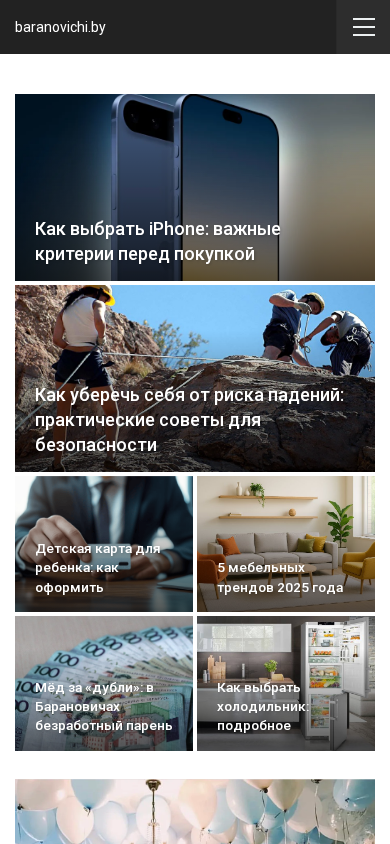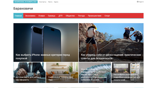| AI-анализ | --- The portal Baranovichi.by is a city internet portal for Belarus, providing news and the most current information for Baranovichi and the Brest region, as well as the world. Topics include daily news, reviews, latest incidents and events in the city, and traffic accident notices. The website features a sign-in page, contact information, and a map. Sections cover economics, the world, border issues, society, weather, and sports. Articles cover topics such as choosing an iPhone, child safety, furniture trends, counterfeit money, and choosing a refrigerator. The website also offers advice on organizing a child's birthday party, the benefits of laser cleaning for cities and industries, selecting a cashpo for a stylish home interior, modern milk production and quality food, the importance of work in contemporary life, and 10 profitable businesses for Baranovichi. The website |