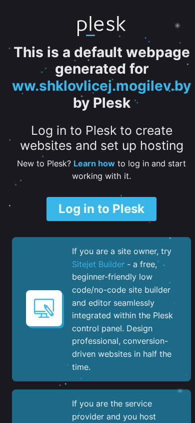 | AI-анализ | The website ww.shklovlicej.mogilev.by is a default webpage generated by Plesk, a web hosting control panel. It offers users the opportunity to create websites and manage hosting services through its user-friendly interface. The page includes instructions on how to log in to Plesk and start using it, as well as an introduction to Sitejet Builder, a free site builder seamlessly integrated within Plesk. Plesk is a comprehensive hosting control panel designed to manage web, DNS, mail and other services, and is suitable for both web professionals and hosting businesses. |