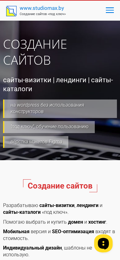 | AI-анализ | This website is a private web developer based in Minsk and throughout Belarus. They specialize in creating websites using WordPress without the use of site builders. The developer also creates contextual ads in Yandex and Google. The website offers services for creating websites "under the key" (turnkey), web design, reclama (reclama likely means reclama or advertising), portfolio, and contacts. The website has a black friday and cyber monday promotion for 290 rubles for a website-visita (likely a website visitor card or business card site). The developer works online without personal meetings and offers a modern individual design, creation and management of a website using the Wordpress system, and support and maintenance. The website also offers a discount for new clients, reducing the cost of a site from 400 rubles to 250 rubles until the end of March. The website |