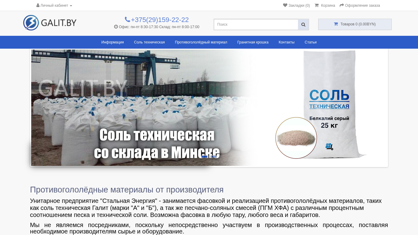 | SEO-описание | Купить противогололедные материалы и галит в Минске и Минской области можно оптом и в розницу в нашем интернет-магазине. Реализуем противогололёдные материалы в том числе Галит с доставкой по Беларуси. Организуем поставку ПГМ, пескосоли, антигололёда и гранитной крошки на любой объект в Минске и Минской области. |