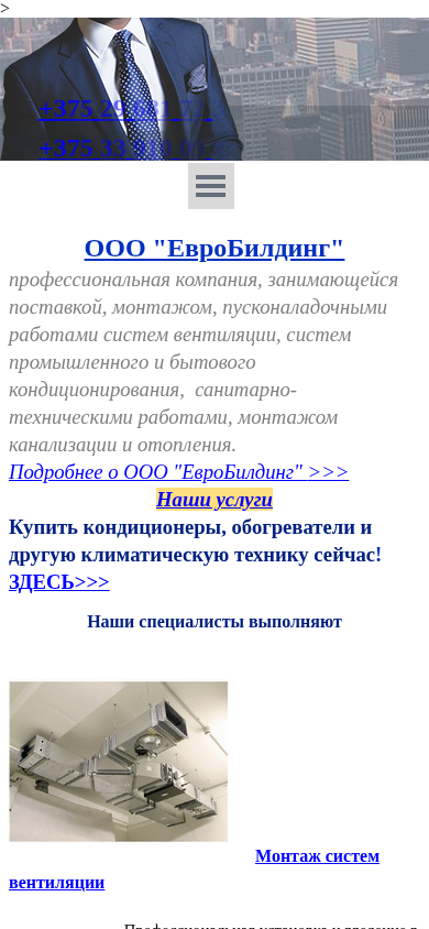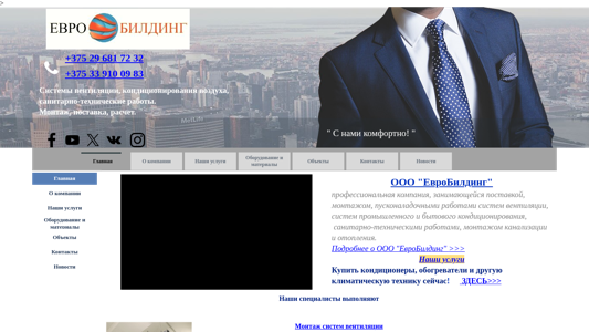 | AI-анализ | language: ru This online resource is a professional company website for ООО "ЕвроБилдинг" in Belarus, which specializes in industrial and residential heating, ventilation, air conditioning, and sanitary technical works. The website provides information about the company's services, which include the sale, installation, and maintenance of ventilation and air conditioning systems, as well as sanitary technical works, heating, and plumbing. The website also offers contacts for the company in various Belarusian cities and provides links to its social media profiles. Keywords related to ventilation, air conditioning, and sanitary technical works are prevalent on the website. |