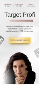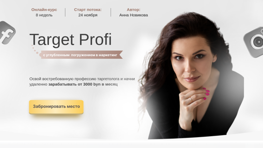 | AI-анализ | The portal Novix.by offers an online course for targeting professionals titled "Target Profi," lasting eight weeks. It starts on November 24, 2022, and is authored by Anna Novikova. The course aims to help individuals become proficient in the field of targeting and begin earning from 3000 BYN per month. The course includes understandable instruction on the profession of targeting, a step-by-step approach, learning marketing fundamentals, daily support from experienced curators, access to closed chats including a chat with job vacancies, a student case chat, and a practical instruction guide titled "How to Make $1000/month." The course also includes exclusive information on finding clients and starting work, as well as results from the author's experience working with over 50 niches in countries of the CIS and Europe, from construction campaigns to online schools |