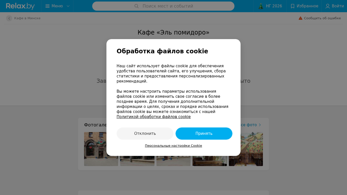 | SEO-описание | Кафе Эль помидоро в Минске – ⚡меню с ценами и фото, ⚡отзывы посетителей, адрес на карте, ✍бронирование столика онлайн на Relax.by. |
