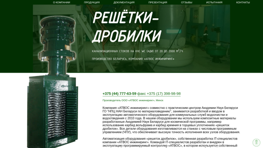 | AI-анализ | This online resource showcases the production of АТВОС инжиниринг, a Minsk, Belarus-based company specializing in the manufacture of wastewater treatment and sewage systems equipment. The site provides detailed information on the company's offerings, including specifications, pricing, photos, videos, and documentation for its line of wastewater treatment and sewage systems products, including channel screens, channel screen crushers, and channel screening and crushing systems. The site also features testimonials, presentations, and contact information. The company's products include channel screens for wastewater treatment plants with a capacity of 20 to 2000 m³/h. The company was founded in 2010 and collaborates with the Practical Center of the National Academy of Sciences of Belarus to develop and introduce automated equipment for municipal water treatment and sewage systems. The |