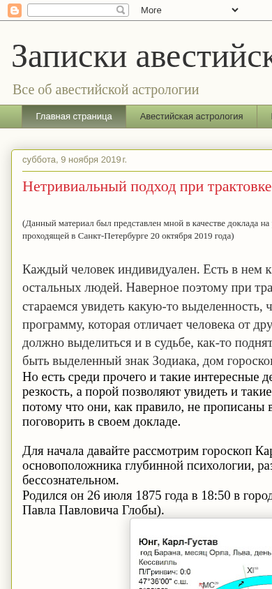 The portal "Записки авестийского астролога" (Notes of an Avestan Astrologer) provides comprehensive information on Avestan astrology. The website covers topics such as astrological interpretations, travels to various countries and continents, and an unconventional approach to horoscopes. The author shares insights into the uniqueness of individuals and the importance of identifying distinct characteristics in horoscopes to create personalized programs. The website includes a discussion on the horoscope of Carl Gustav Jung, a famous psychologist and founder of depth psychology, highlighting his Sun sign, Taurus, and its significance in his life and work. The portal also explores lesser-known astrological details that can reveal subtle nuances and provide valuable insights.
