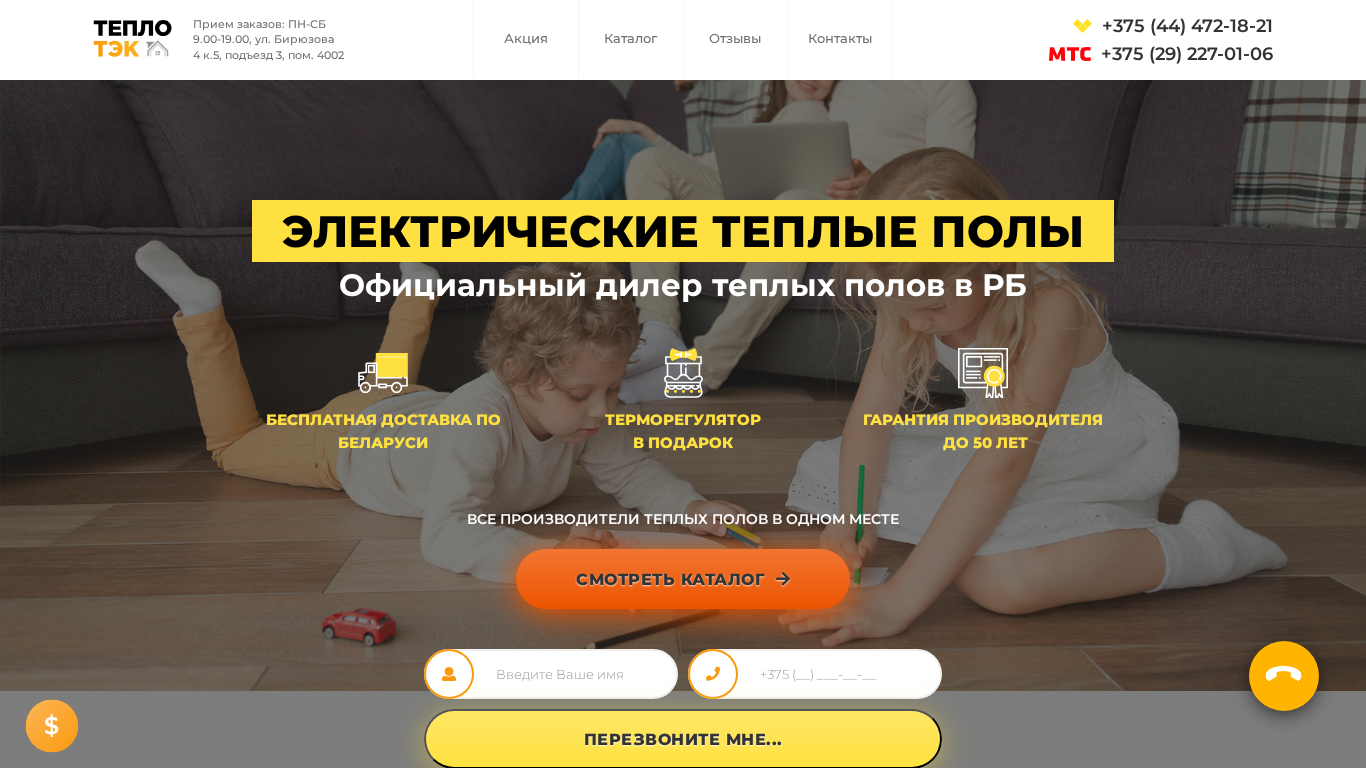 | AI-анализ | --- The web project Electropol.by is a specialized online store selling electric heating floors from the Netherlands with delivery to Belarus. The store offers various brands of heating floors in one place, along with a catalog, customer reviews, and contacts for inquiries. The store is open for orders Monday through Saturday from 9:00 to 19:00, located at Biрюzova Street 4, building 5, entrance 3, apartment 4002. Customers can contact the store using the phone numbers +375 (44) 472-18-21 and +375 (29) 227-01-06 for returns or inquiries. The store provides a thermoregulator as a gift with the purchase of a heating floor, along with a manufacturer's guarantee of up to 50 |