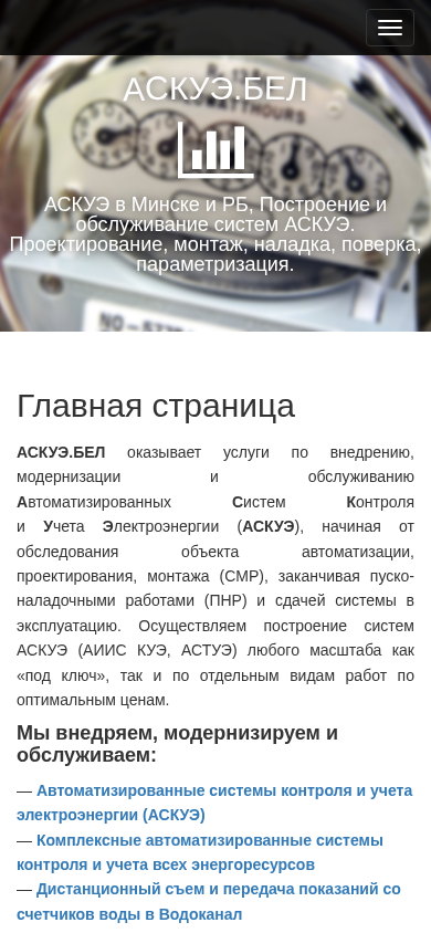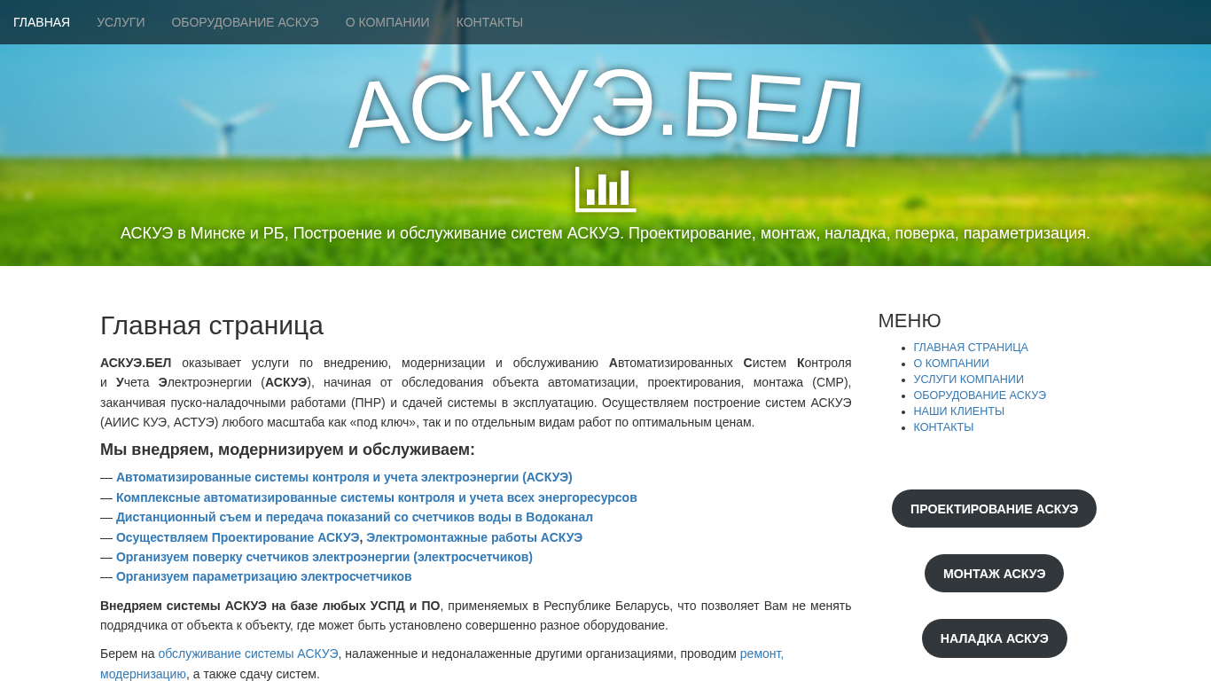 | AI-анализ | The web project ASKEU in Minsk and Belarus. Project, mounting, commissioning, handover. ASKEU in Minsk and Belarus offers services for the implementation, modernization and maintenance of automated systems for the control and accounting of electrical energy (ASKEU), starting from the inspection of the object of automation, project design, mounting (SMR), commissioning (SNR), and ending with the delivery of the system into operation. We build ASKEU systems (AIISSKEU, ASTUE) of any scale as a turnkey solution or separately by type of work at optimal prices. We install, modernize and maintain: — Automated control and accounting systems for electrical energy (ASKEU) — Complex automated systems for controlling and accounting of all energy resources — Remote data collection and transmission of water meter readings to the Water Utility — We provide project design |