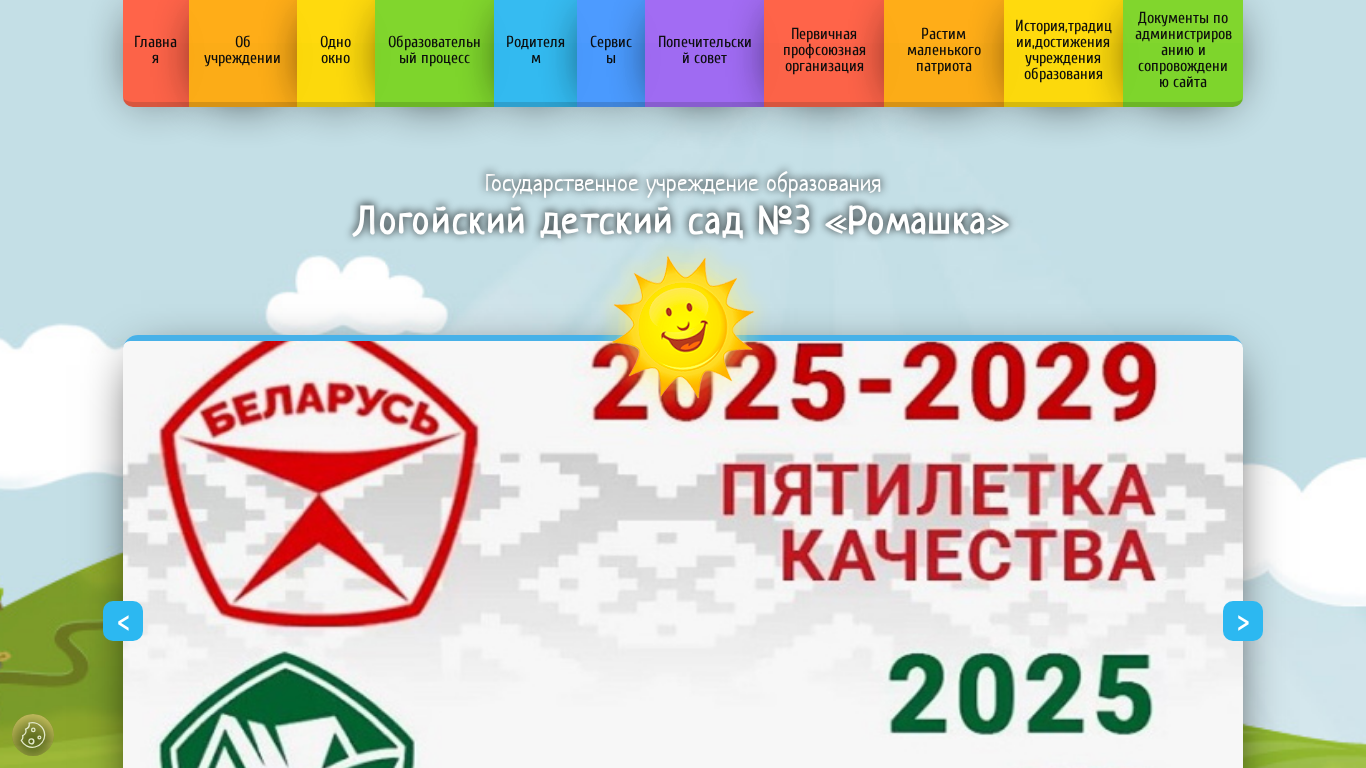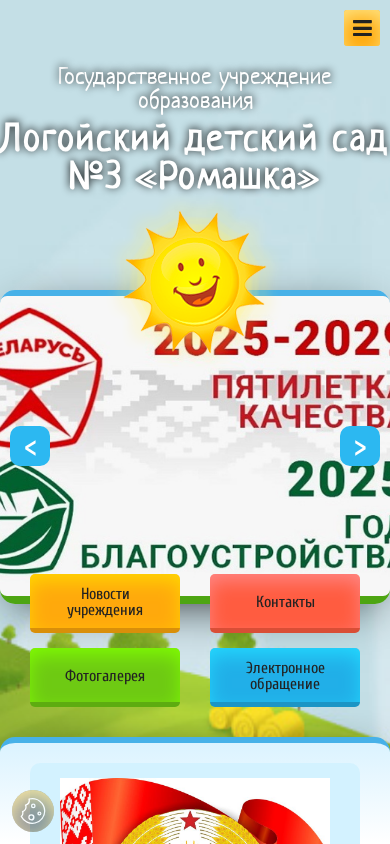 --- This online resource is the official website for Logoisky Detsky Sad №3 "Romaшка" (Logoisk Childcare Center №3 "Romaшка"), an educational institution in Belarus. The site contains information on the administration, staff, admission process, educational programs, and various initiatives of the kindergarten. Users can find details on the conditions for enrollment, the work schedule of the administration, the visiting hours for parents, and the educational philosophy of the kindergarten. The site also includes a photo gallery, news section, and information on the educational process and safety measures. Additionally, the site features a section on the history and achievements of the kindergarten, as well as a section on parental advice and support. The domain name is sad3.logoysk-edu.gov.by.