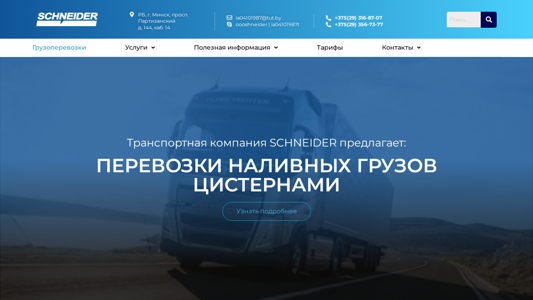 | Название / Заголовок | SCHNEIDER — Перевозка грузов, наливом, цистернами — Грузоперевозки в Минске. Услуги по перевозке наливных грузов по направлениям: Беларусь — Россия, Беларусь — Литва, по Беларуси, по России и странам СНГ |