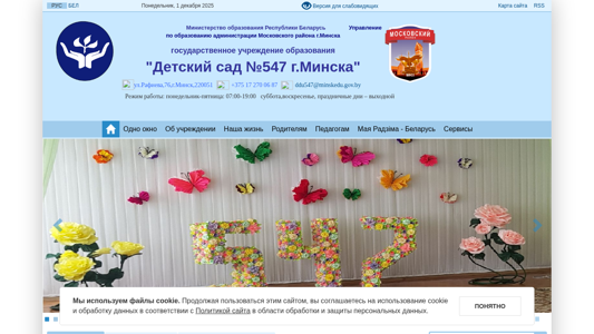 | AI-анализ | The web project "Детский сад №547 г.Минска" (Children's Garden No.547 in Minsk) is an educational institution in Belarus. The site uses cookies and requires agreement to their use and data processing according to its privacy policy. The site includes information on the institution's location, contact details, working hours, administrative contacts, and various educational and administrative procedures. Popular requests and forms for electronic applications are also available. The site is governed by the Ministry of Education of the Republic of Belarus and the Moscow District Administration of Minsk, and is subject to various administrative procedures and normative legal acts. The institution offers social-pedagogical support and psychological assistance, special education, and various educational services, including on a fee-paying basis. It also includes a primary trade union organization, information on various community organizations, and virtual tours of the facility. |