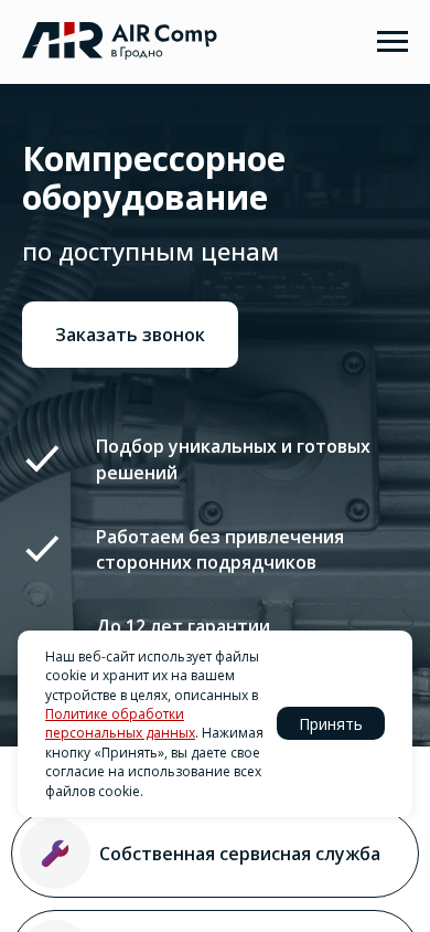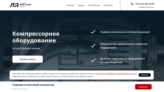 | AI-анализ | The portal AirComp in Grodno offers sales, rental, and delivery of screw compressors, as well as repair and provision of spare parts in Grodno and the Grodnen region. The company guarantees maintenance services and provides detailed consultations on equipment features. Contact information is available at +375 (33) 300 34 00 or [info@air-grodno.by](mailto:info@air-grodno.by). The website features a catalog, company information, and contacts. The company offers compressor equipment at affordable prices, allows users to request a call, and provides solutions tailored to specific needs. AirComp does not outsource services to external contractors, and offers up to twelve years of equipment manufacturer warranty. The website also includes a catalog of services, information about the company, and contact details. The company has been in business since 2 |