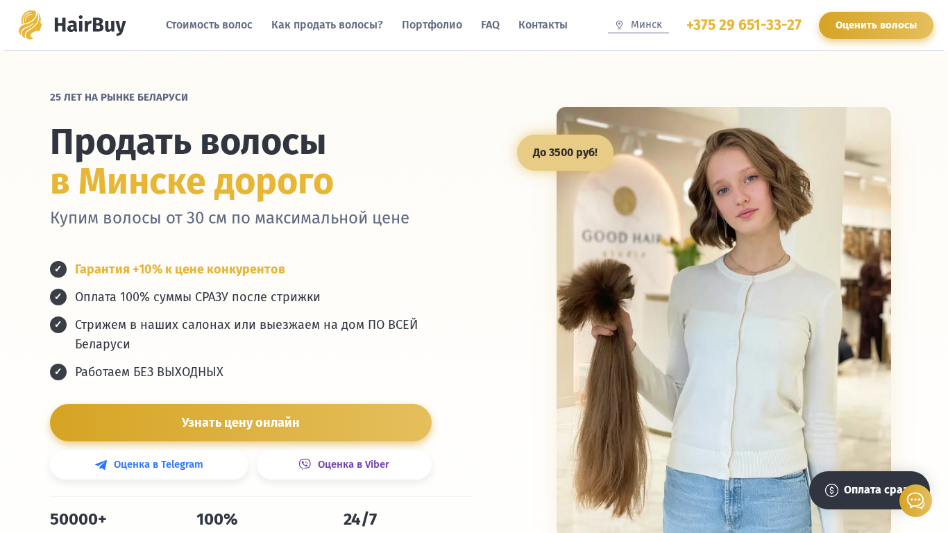 | SEO-описание | ✅ Покупаем натуральные волосы в Минске и по всей Беларуси от 30см по МАКСИМАЛЬНОЙ цене. 25 лет на рынке, 50000+ довольных клиентов. Гарантия честной скупки волос. Оплата 100% сразу после срезания. Выезд на дом 7 дней в неделю. Звоните: +375 29 651-33-27. Женские, мужские, детские волосы. |