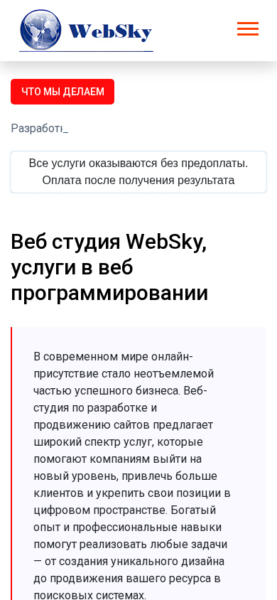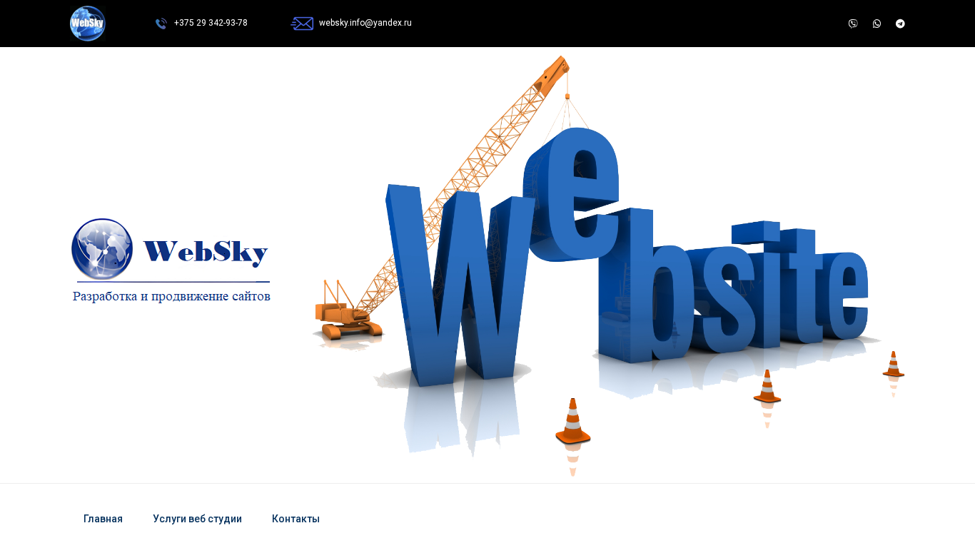 | AI-анализ | The web project websky.by is a web studio offering website design, creation, and promotion services for sites of any topic and complexity. The studio operates in all cities of Belarus, working both with corporations and individual clients. Keywords: web studio, sites, web, 375, 342-93-78, websky, info@yandex.ru, design, creation, promotion, services, Belarus. The site provides information on the studio's offerings, including website design and creation, site promotion, site rental, site administration, and contextual advertising setup. The studio offers a full range of services for businesses, from creating a unique design to promoting websites in search engines. All services are provided without upfront payment, with payment due upon completion. WebSky is a web studio specializing in web development. In today's digital world, online presence has become |