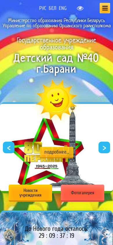 This online resource is a website for a kindergarten named "Detsky sad #40 g.Barani" (Children's Garden #40 in Barani). The title and description suggest that it is a government institution located in the city of Barani, Belarus. The website provides information about the kindergarten's structure, work schedule, and various educational and administrative aspects. It also includes sections on the institution's history, traditions, and achievements, as well as rules for pedagogical workers and conditions for admission. The website offers a photo gallery, information about the union, and various local documents, including registration and licensing information. The primary keywords associated with the site are "children's garden," "Barani," and "education." The site also includes sections on state symbols, social-psychological services, and a memorandum on sexual non-interference.