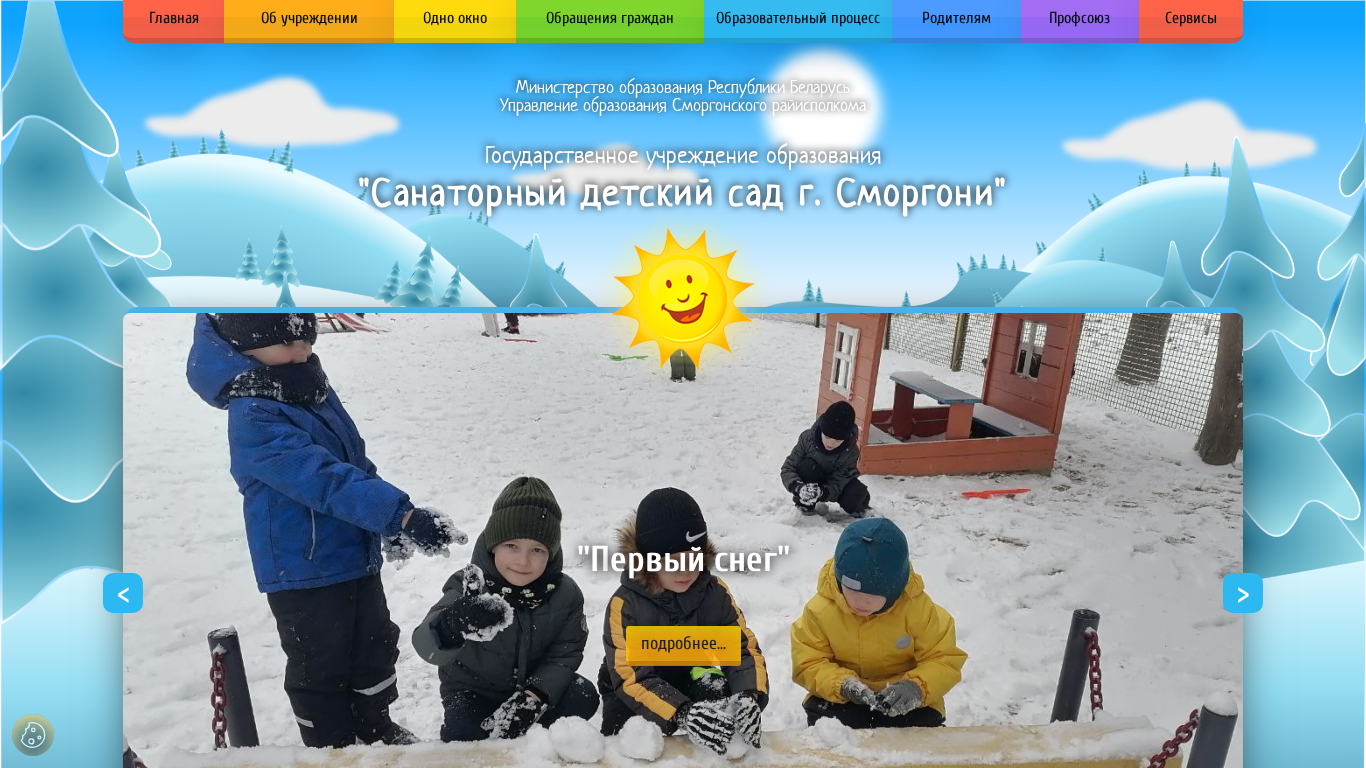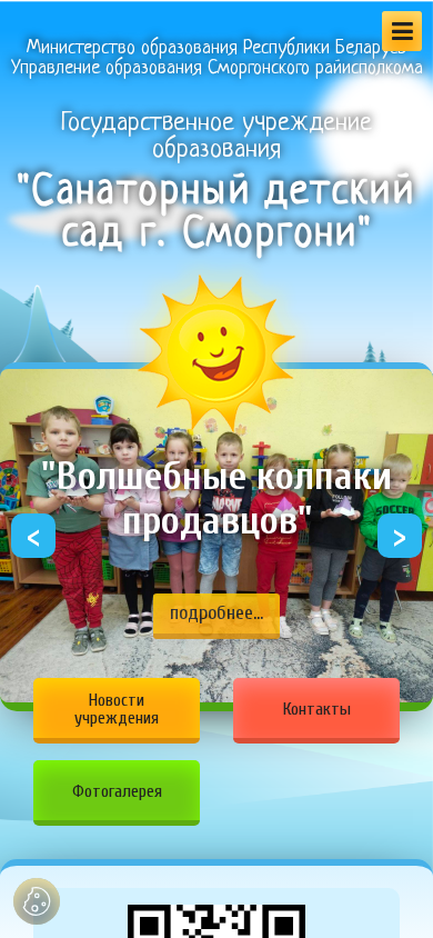 | AI-анализ | The web project "Санаторный детский сад г. Сморгони" (Sanatornyy detskiy sad g. Smorgoni, or Sanatorial Kindergarten of Smorgoni) is a Belarusian educational institution based in Smorgoni. The keywords suggest that it is a kindergarten and sanatorium, with a focus on early education and healthcare. The title and description are in Russian, with the former translating to "Sanatorial Kindergarten of Smorgoni" in English. The website provides information about the kindergarten's management, tasks, functions, staff, upcoming enrollment, and various policies. There are also sections dedicated to the kindergarten's history, achievements, and photo gallery. The website complies with legal regulations and offers a hotline for inquiries, as well as electronic submission of requests. The kindergarten |