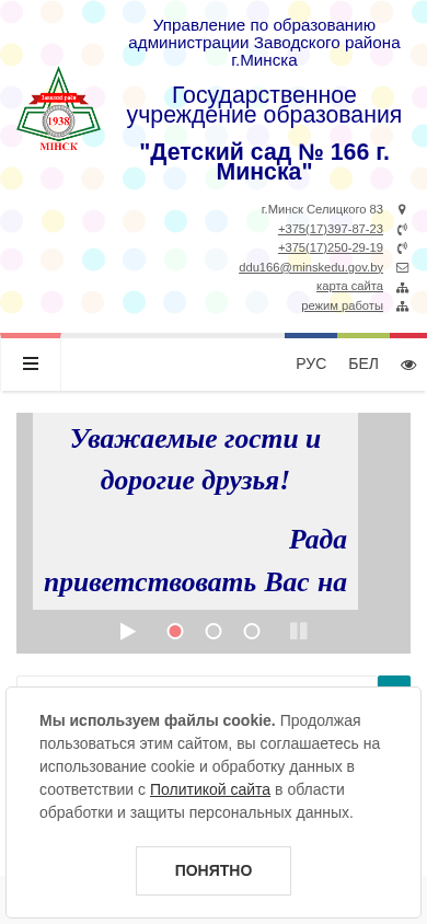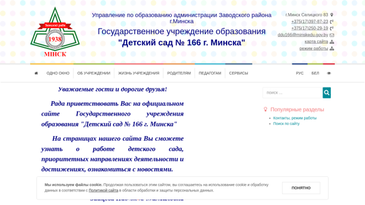 The website "Детский сад 166" (Childcare Center 166) is a government educational institution located in Minsk, Belarus. The website provides information about the kindergarten, including its location, contact details, working hours, administrative procedures, and policies regarding the handling of personal data. The site includes a map, a one-window service, and a section for popular inquiries. Visitors can find information on various administrative procedures, including application forms and contact details for higher-level organizations. The website also includes a section for news and announcements. The kindergarten uses cookies and requires users to agree to their privacy policy before continuing to use the site. The site is operated by the Administration of the Childcare Center No. 166 in Minsk.