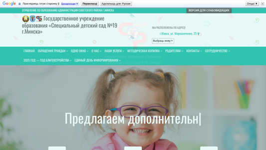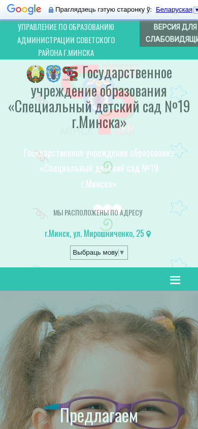 | Адрес | Управление по образованию Советского района г. Минска, ГУО «Специальный детский сад №19 г. Минска», г. Минск, ул. Мирошниченко, 25 |