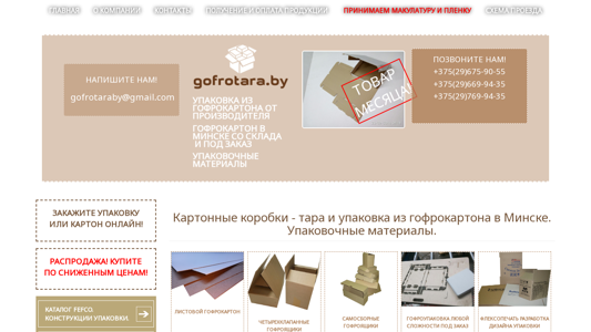 This website is an e-commerce platform for cardboard boxes and packaging materials made of gofrocard (gofrocard is a type of corrugated cardboard) in Minsk, Belarus. The website offers both ready-made and custom cardboard boxes for various industries and products, such as machinery, electronics, and paper items. The main page includes a call-to-action to contact the company for orders and information, with phone numbers and an email address provided. The menu includes sections for the company, contacts, delivery and payment, and a catalog featuring various types of packaging materials and their specifications. The website also offers a 'Product of the Month' promotion and a section for additional packaging materials like scotch, stretch film, and protective corners. The domain name, gofrotara.by, directly relates to the business name and industry.