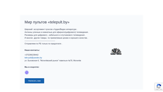 | AI-анализ | The website 'Mir pultov telepult.by' offers a wide range of pullets for audio/video equipment. It includes outdoor and indoor antennas for terrestrial (digital) television, as well as receivers for digital, cable, and satellite television. The website also sells many other items at reasonable prices and good quality. Orders are sent to Belarus only upon prepayment. The contact information provided is +375296239442, tele-pult@yandex.by, and ul. Byhovskaya 6, Pavilion №78, Mogilevsky Rynek, Moгилёв. The website also has social media presence and an option to create a free site-visiting card with hoster.by. |