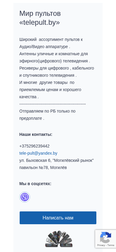 | Адрес | Отправляем по РБ только по предоплате ., Наши контакты:, +375296239442, tele-pult@yandex.by, ул. Быховская 6 |
