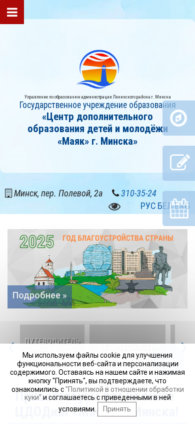 | AI-анализ | This online resource is the official website of the State Educational Establishment "Supplementary Education Centre for Children and Youth 'Mayak' of the city of Minsk". The site provides information on various clubs, studios, and organizations for children and youth. Offerings include Art, Vocal, Choreography, Early Development School, Quadricycle Driving, and others. The public is invited to enroll. The website also includes news, regulations, and contact information for the Centre, which is located in Minsk, at Per. Poliev, 2a. The phone number is 310-35-24. The site is available in Belarusian and other languages. |