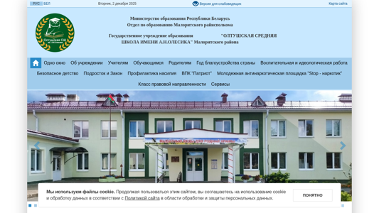 | AI-анализ | The portal 'Олтушская СШ' (Oltushskaya Srednyaya Shkola Imeni A.N.Olesika) is a website for a middle school in Belarus. It provides information about the school, its schedule, enrollment procedures, contacts, and various educational resources. The main sections of the site include administration, academic programs, student services, and extracurricular activities. The site also features a news section, library, and historical museum. The design is standard with a mid-sized font and normal inter-word spacing. The color scheme is gray with black text. Images are turned off, but there is a section for downloading forms and applying for services electronically. The site includes links to various educational and government organizations, as well as a rating evaluation portal. The school's mission, history, and notable achievements are also outlined on the site. The site |