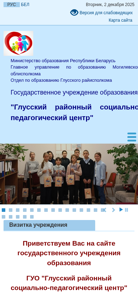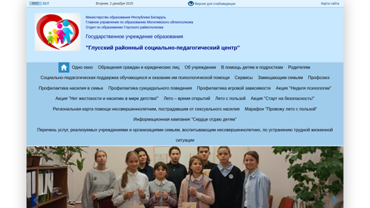 | AI-анализ | This online resource is the official website of the "Głuski Regional Social-Pedagogical Center" (Глусский районный социально-педагогический центр) in Belarus. The site provides information about the center's structure, administrative procedures, normative legal acts, and contact details for various departments and services. It includes sections for parents, educators, and social workers, offering advice, resources, and support. The site also features a news section, a FAQ section, and a calendar of events. The content is primarily in Russian and Belarusian, with some sections available in standard and large font sizes. Images are disabled by default, with an option to view them in black and white. Additional features include RSS feeds, a site map, and an archive of past news articles. The domain is managed by the Ministry of Education of the Republic of Belarus |