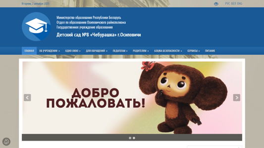 | AI-анализ | The web project "Детский сад №8 «Чебурашка» г.Осиповичи" (Children's School No. 8 "Cheburashka" in Osipovichi) is a government educational institution in Belarus. It is under the jurisdiction of the Ministry of Education of the Republic of Belarus and the Osiipovichi Regional Executive Committee. The website provides information about the kindergarten, including its location, structure, management, staff, hours of operation, admission process, and services offered. Some of the key topics covered are the licensing information, the organizational structure, the working hours of the management team, the tasks and functions of the kindergarten, the admission policy, the provision of assistance to disabled children, the history and achievements of the kindergarten, news, photo gallery, trade union, and contact information for various authorities and hotlines |