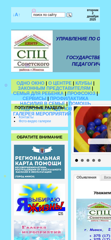 | AI-анализ | The portal 'Soviet Social-Pedagogical Center' in Minsk, Belarus, is a government educational institution providing various services for families, children, and legal representatives. The website offers sections on clubs, support for families, services, and prevention of domestic violence. A friendly room for consultations is available for children who have been victims or witnesses of violence. The center also runs a youth organization named "CDP Juventus." News, popular sections, and contacts are accessible, along with photo and video galleries. Visitors can change the font size using the 'Ctrl' key and the '+' or '-' signs, or by scrolling. The website's address is 2-й Izmajlovskiy Pereulok, d.13, in the Soviet District of Minsk. The center welcomes visitors to its official site and provides contact numbers for its hotline. |