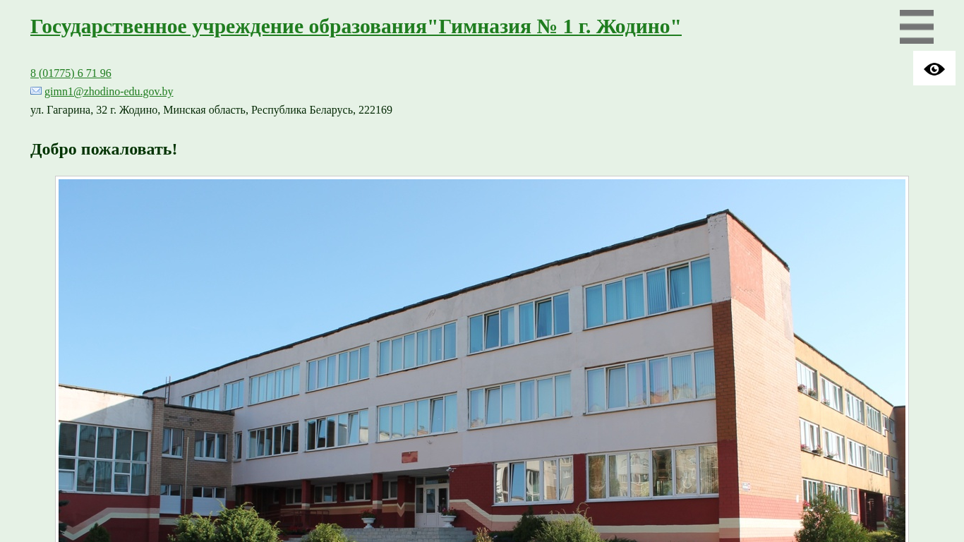 | Адрес | Факс :, 8 (01775) 6 71 96, E-mail :, gimn1@zhodino-edu.gov.by, Сайт :, www.gn1zh.guo.by, Карта проезда, [Постоянная ссылка], Банковские реквизиты учреждения, ГУО «Гимназия №1 |