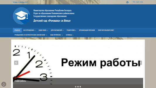 | AI-анализ | The portal "Детский сад «Ромашка» аг.Вязье" (Children's Garden 'Romaшка' in Viazye) is a government educational institution website in Belarus. It provides information about the kindergarten, its management, pedagogical staff, news, and regulations. The kindergarten is located in the Osiopovich region and falls under the Ministry of Education of the Republic of Belarus. The website includes sections on the kindergarten's history, traditions, achievements, rules for pedagogical workers, and contact information. Additionally, there are sections dedicated to various initiatives, such as the year 2025 being declared the Year of Improvement, the emblem commemorating the 80th anniversary of Belarus' liberation from Nazi occupation, and social-pedagogical support and psychological help for parents. |