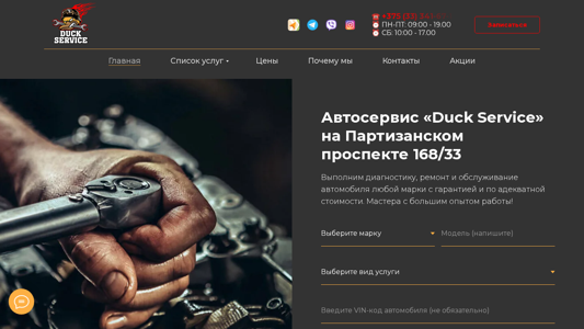 | AI-анализ | language: ru The web project "Duck Service" is a car service located in the Industrial District of Minsk, Belarus, at Partisan Prospekt 168/33. The company offers diagnosis, repair, and maintenance of cars of any brand with a guarantee and at an affordable price. Services include repair of engines, transmissions, suspensions, steering systems, cooling systems, fuel systems, and brake systems, as well as replacement of filters and oils. Customers can book an appointment by phone. The menu also includes a list of services and prices, information about why to choose the service, and contacts. The domain is registered in the .BY ccTLD and is in the Russian language. |