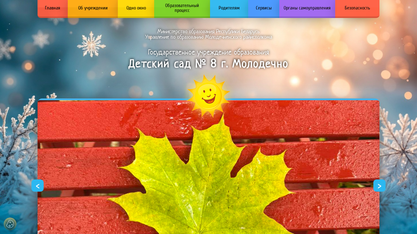 | AI-анализ | The portal Sad8mol.uomrik.gov.by is a website for a kindergarten named "Detsky sad № 8 g. Molodechnо" located in the city of Molodechnо in Belarus. The website provides information about the kindergarten's management, pedagogical team, admission process, contacts, structure, rules for pedagogical workers, news, photo gallery, and various educational and support initiatives. Keywords associated with the site include "education," "kindergarten," "Molodechnо," and "news." The site also features interactive maps of the educational network in the district, vacancies, a virtual methodological cabinet, and civic and patriotic education resources for parents. The kindergarten's mission, history, and achievements are also highlighted on the site. The website is operated by the Molodechnо city executive |