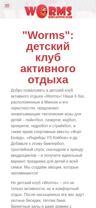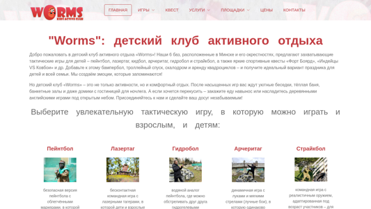 The portal worms.by is a children's club for active leisure in Minsk, Belarus. It offers various tactical games such as paintball, laser tag, airsoft, archery tag, hydroball, and strikeball, as well as sporty quests like 'Fort Boyard' and 'Indians vs Cowboys'. Additionally, it provides services for organizing children's parties, renting bananas, and arranging outdoor games. The club also offers free activities, a gift certificate, and the rental of numbers and food catering. Visitors can enjoy activities at six bases located in Minsk and its surroundings. The club not only focuses on activities but also provides a comfortable rest with cozy lounges, a warm sauna, banquet halls, and even cottages with a guesthouse for overnight stays. Food can be ordered in or enjoyed with wooden