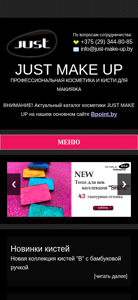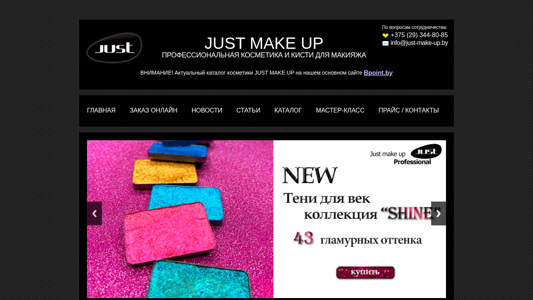 | AI-анализ | The portal just-make-up.by is the official website of JUST MAKE UP, a distributor of professional decorative cosmetics in Minsk, Belarus. The site provides information on the company and offers the purchase of Just Make Up cosmetics, including makeup brushes, both in bulk and retail. Visitors can find the latest catalog on the main Bpoint.by site. For inquiries regarding partnerships, contact +375 (29) 344-80-85 or email info@just-make-up.by. The site includes news, a catalog, master classes, and price/contact information. New product releases, such as a stable eyeliner and new beauty blenders, are announced in the news section. JUST MAKE UP partners include the Queens beauty agency school. The legal address is in the Minsk region, while the operational |