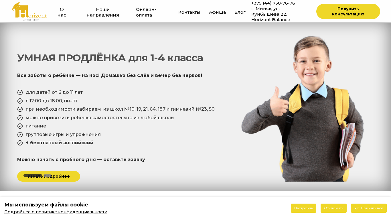 | SEO-описание | Курсы, кружки, секции для детей от 1до 14 лет в Минске. Детский развивающий центр «Горизонт» в Минске - дополнительное образование для детей. В наших курсах: школа раннего развития, английский, рисование, робототехника, ментальная арифметика, скорочтение и многое другое. |
