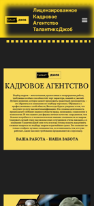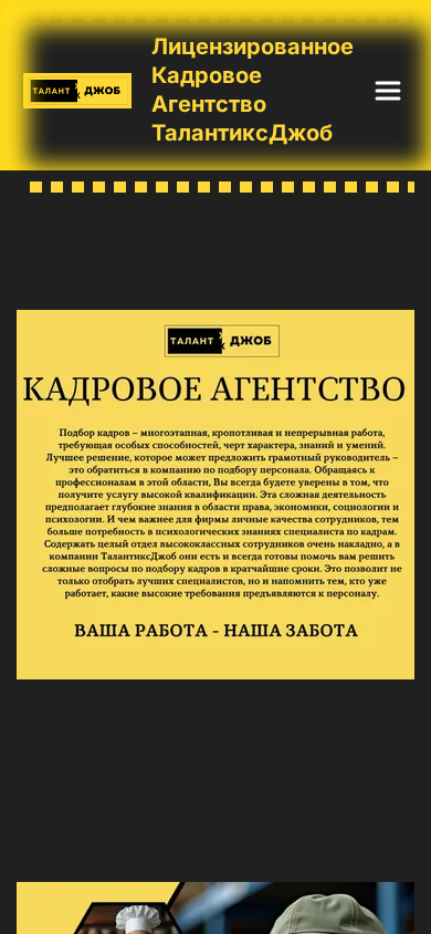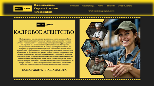 | AI-анализ | --- This website is for TalantXjob, a licensed staffing agency in Belarus. The homepage includes sections for our team, services, vacancies, and contact information. Visitors can leave a request for a callback, view job openings and their respective wages, and read testimonials from previous clients. The agency guarantees a personalized approach for each client, offering replacement candidates within a month if needed. The recruitment process includes an initial discussion of hiring challenges, signing a contract, and a search for suitable candidates through interviews and resume screening. Once a candidate is selected, TalantXjob ensures their adaptation to the new workplace and resolves any potential conflicts as a mediator. The website provides a phone number and email address for contact, located in Baranovichi, Belarus. |